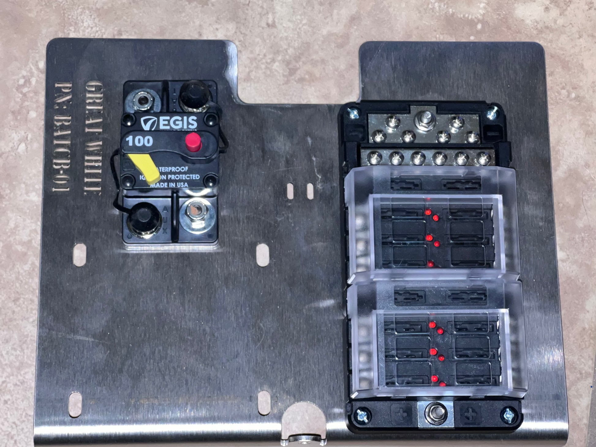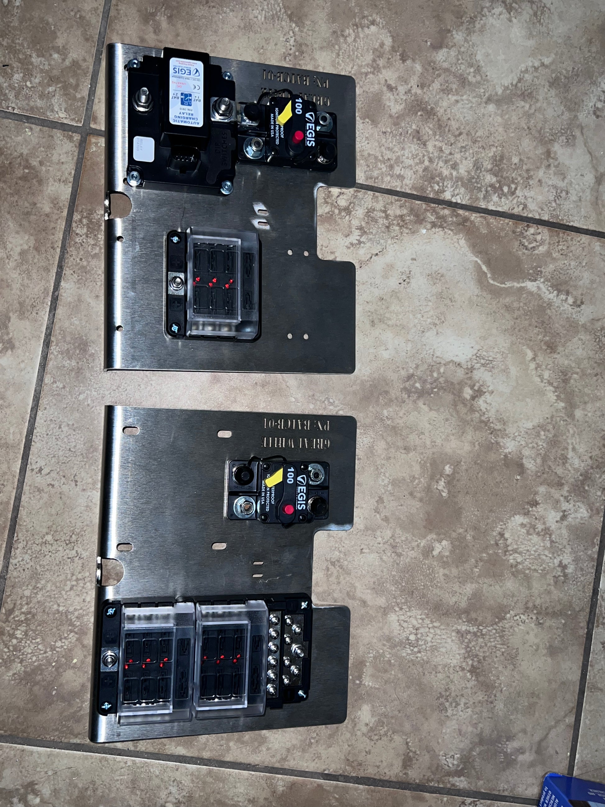 Each side of the plate has a roughly 4.3" wide by 6.5" tall mounting area with the right side drilled for the RT fuse blocks, and the left side drilled for a circuit breaker and Egis Automatic Charging Relay (ACR).